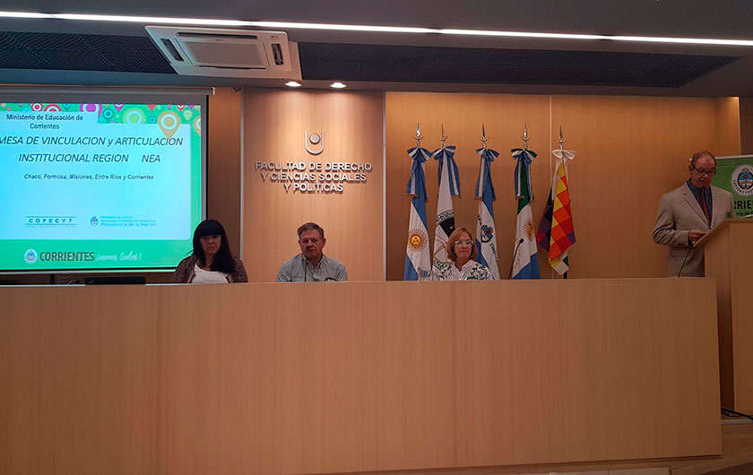 Con la participación de representantes de las cinco provincias del NEA, (Chaco, Formosa, Misiones, Entre Ríos, Corrientes), se realizó esta mañana la mesa de Vinculación y Articulación Institución Regional. “Nos toca ser anfitriones por ser yo quien ejerce la representatividad a nivel nacional de la región NEA”, explicó la directora de Ciencia y Técnica del Ministerio de Educación Marisa Sosa Dansey.
