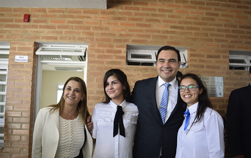 Continuando con la jornada iniciada en la ciudad de Santa Lucía, Gustavo Valdés abrió el ciclo lectivo 2019 en la Escuela Secundaria del sur de la segunda ciudad, estrenando la nueva infraestructura. Allí, estuvo acompañado por el vicegobernador Gustavo Canteros; el intendente municipal, Ignacio Osella; el presidente de la Cámara de Diputados, Pedro Cassani; la ministra de Educación, Susana Benítez; la directora de Enseñanza Media, Práxedes López y la titular de la institución, Laura Escobar.