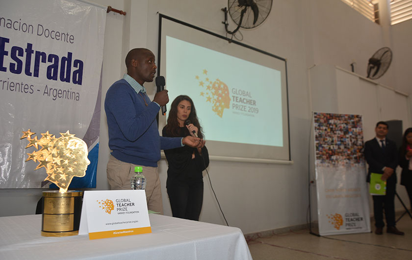 Sobre el mediodía, las autoridades educativas junto al mejor maestro del mundo visitó el Colegio Secundaria del Barrio Apipe donde conversó con un grupo de alumnos y dijo: “Muchos de ustedes deben pensar que lo que están realizando es algo simple pero no saben lo importante que esto es para su futuro, escuchen los consejos de sus maestros y déjense guiar por ellos porque están para acompañarlos y hacer que su futuro sea cada día mejor. Trabajen en equipo y respétense entre ustedes, sean humildes para acompañar y ayudar, busquen la manera de cómo pueden llevarse bien con el otro para ser una parte activa de la sociedad y mejorarla”, dijo. Así como también, agradeció las cartas que recibió de parte de los estudiantes del colegio para sus alumnos en Kenia: “estoy seguro que estarán muy contentos de recibirlas, nos va a enriquecer mucho todo lo que ustedes nos escribieron para nosotros y me gustaría dentro de un tiempo contestarles y que mis alumnos puedan conocerlos a todos y agradecerles el hermoso gesto que tuvieron”.